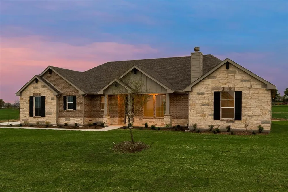 The four-bedroom Caddo floor plan is perfect for entertaining, starting with its striking curb appeal. Homeowners can choose from seven unique elevations, each featuring large windows and stunning stonework that make a statement as guests arrive. Inside, a covered porch leads to an open gathering space where the family room, dining area, and gourmet kitchen blend seamlessly. The oversized island serves as the centerpiece, allowing you to host with ease, whether for intimate dinners or large gatherings. A door to the backyard enhances your entertaining options, while the cozy fireplace at the other end of the space adds warmth. The owner’s suite, tucked in the back corner, offers privacy with a spacious layout, double vanities, a separate water closet, and a large walk-in closet. Conveniently, the laundry room is across from the suite, perfect for easy chores. Three additional bedrooms, each with double-door closets, share a full bathroom down a private hallway.