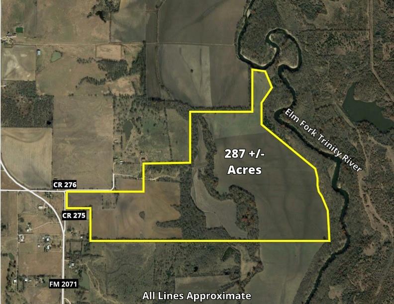Beautiful property located less than 10 minutes from I35 and approximately one hour from the Metroplex and DFW Airport. Approximately 287 acres of improved coastal bermuda hayfields, great croplands, beautiful mature oaks and hardwoods and excellent deer, turkey and hog hunting combine for a multi use property. Fields are fenced and cross fenced with a large pond also on the acreage. East property borders Ray Roberts Corps of Engineers land running along the Elm Fork Trinity River. All information is deemed reliable but not guaranteed. Buyer and buyer's agent to verify that all information contained herein is accurate.